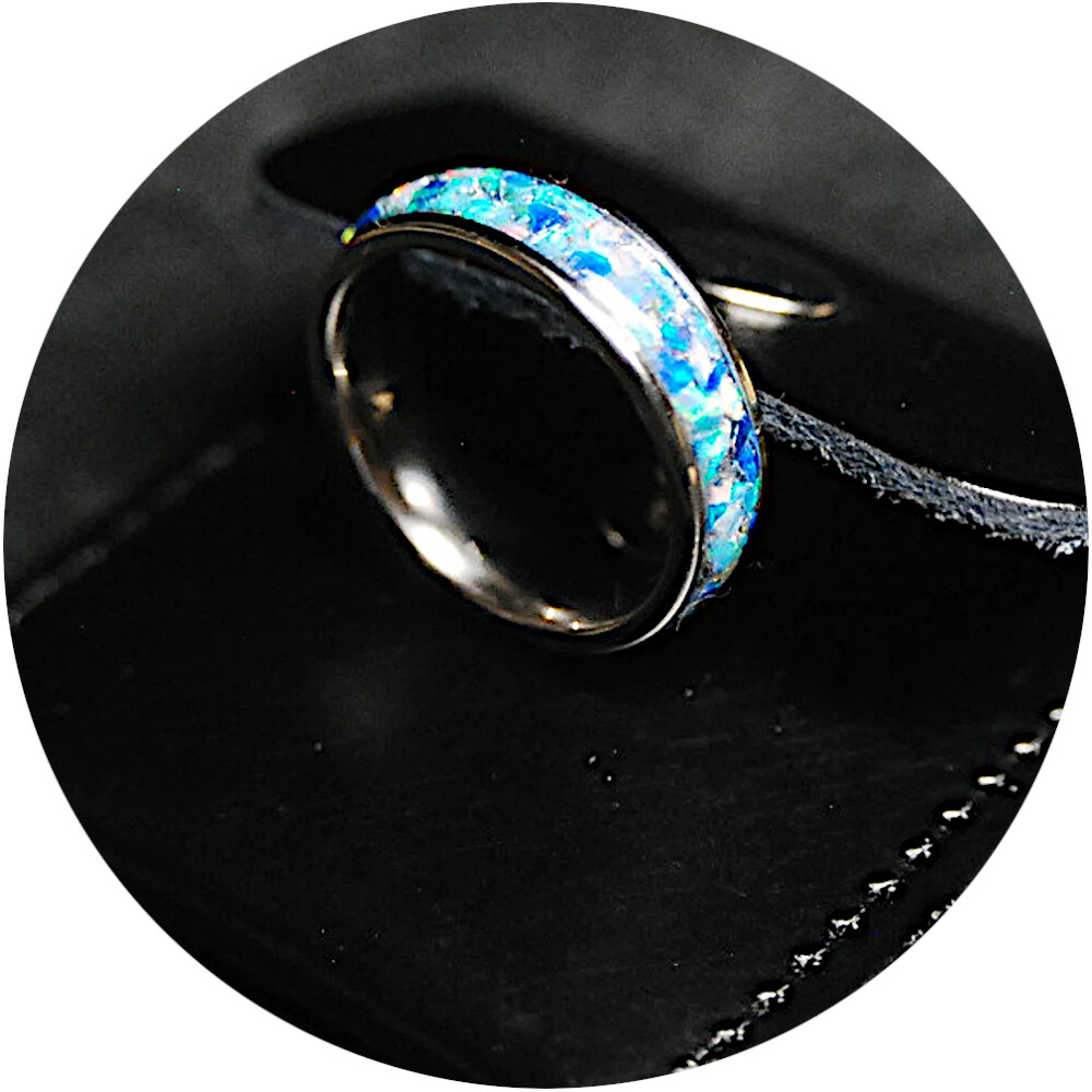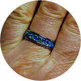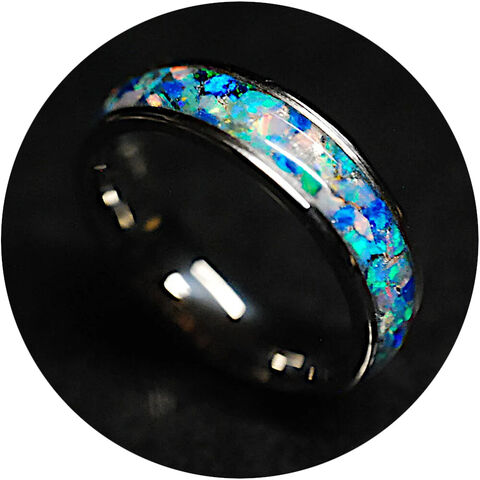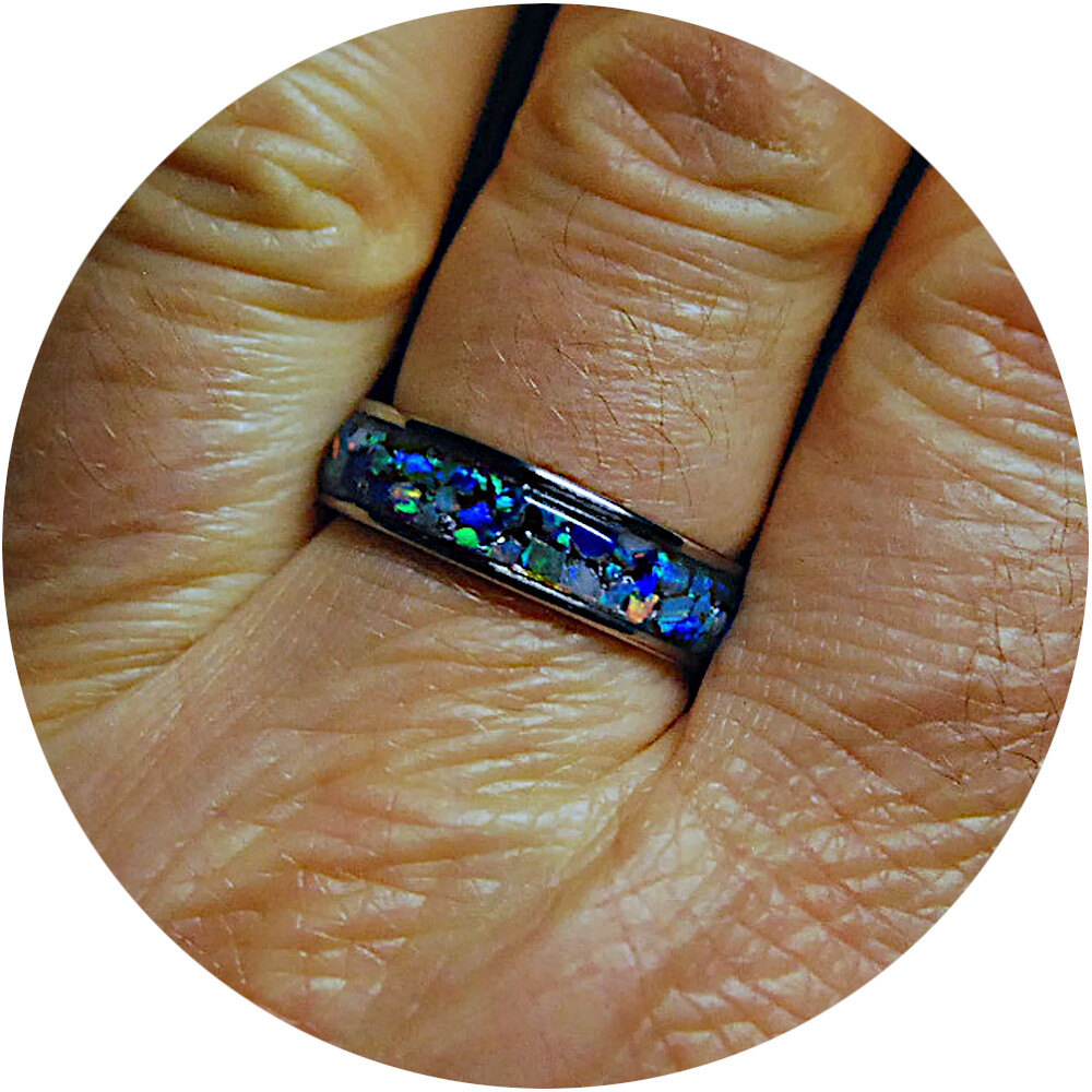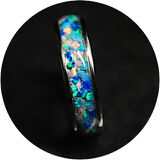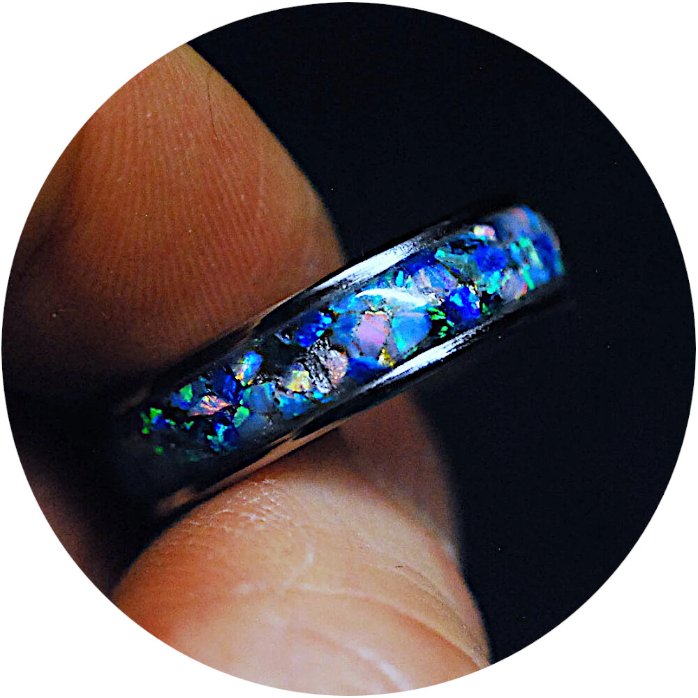 Stainless Steel Comfort Ring 6mm wide single channel, inlaid with premium grade Bello Opal® gemstone from Japan, with the brilliant Aquarian Mermaid Opal. Durable High gloss, waterproof finish!