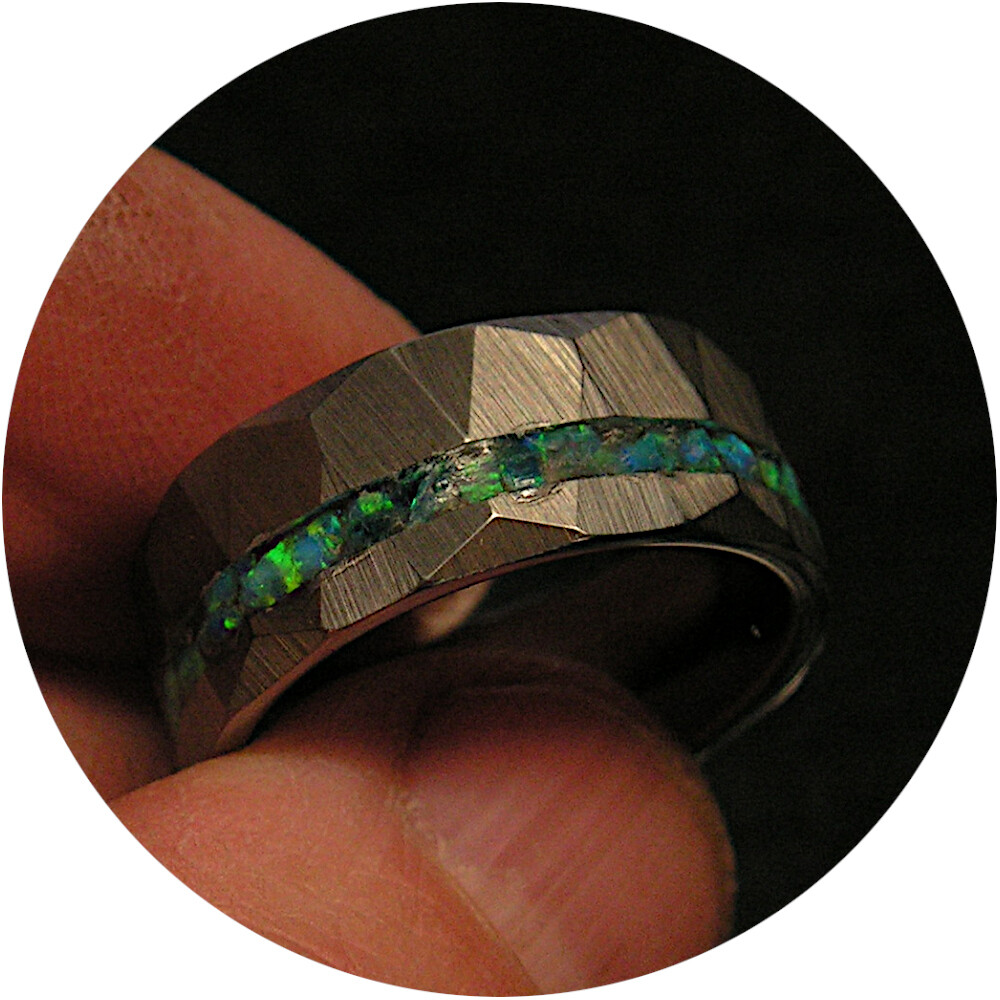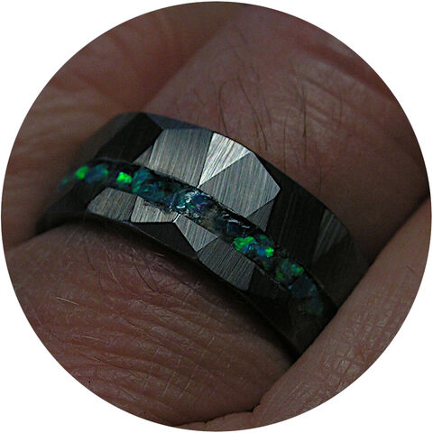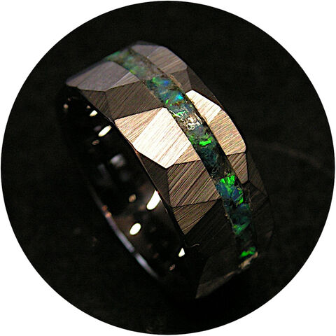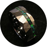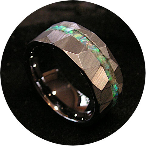 Hammered Tungsten Comfort Ring 8mm wide single channel, inlaid with premium grade Bello Opal® gemstone from Japan, with the brilliant Green Jade Opal. Durable High gloss, waterproof finish!