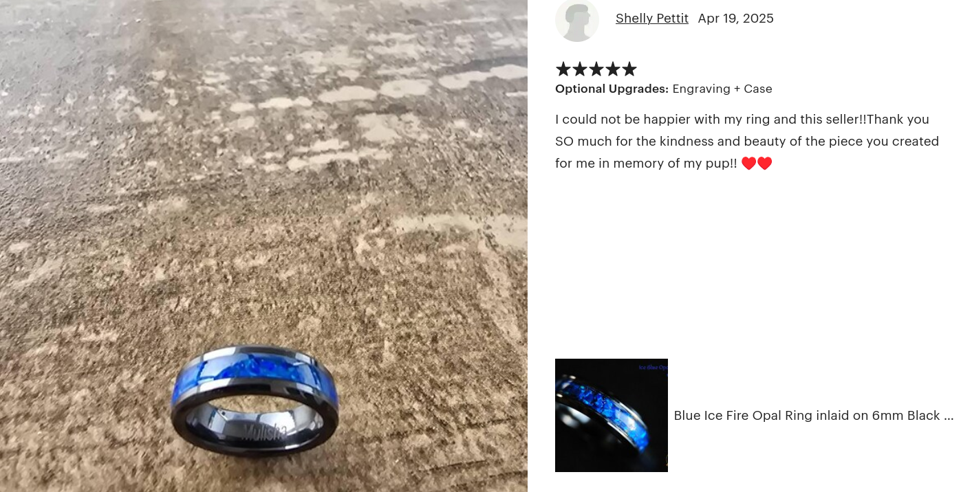 The pet cremains are encased in dyed resin and filled with crushed opal pieces for a uniform sparkly look. Finished in high gloss, very durable and waterproof coating for daily wear!