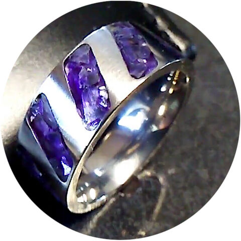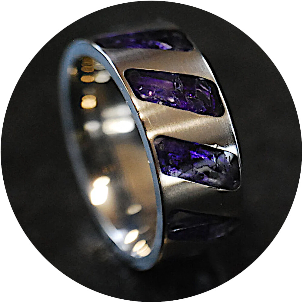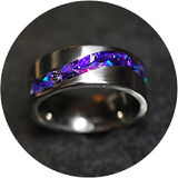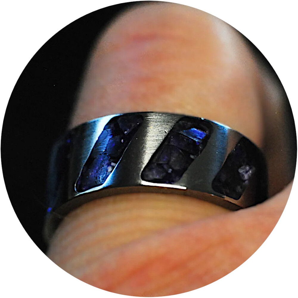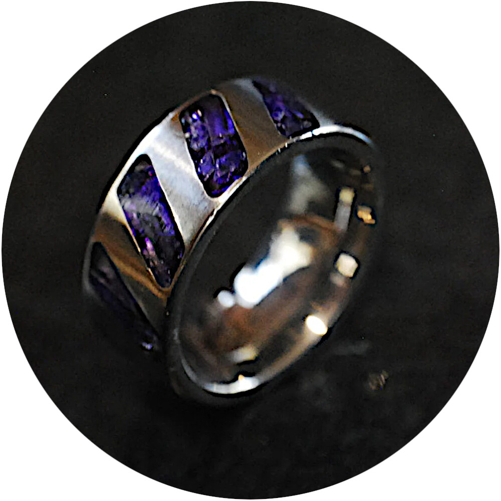 Titanium Rectangled Comfort Ring 8mm wide single channel, inlaid with premium grade Bello Opal® gemstone from Japan, with the brilliant Indigo Opal and Purple Glass Shards. Durable High gloss, waterproof finish!