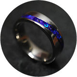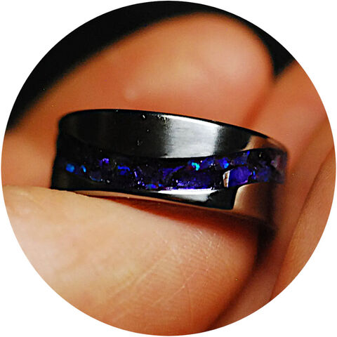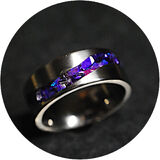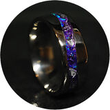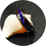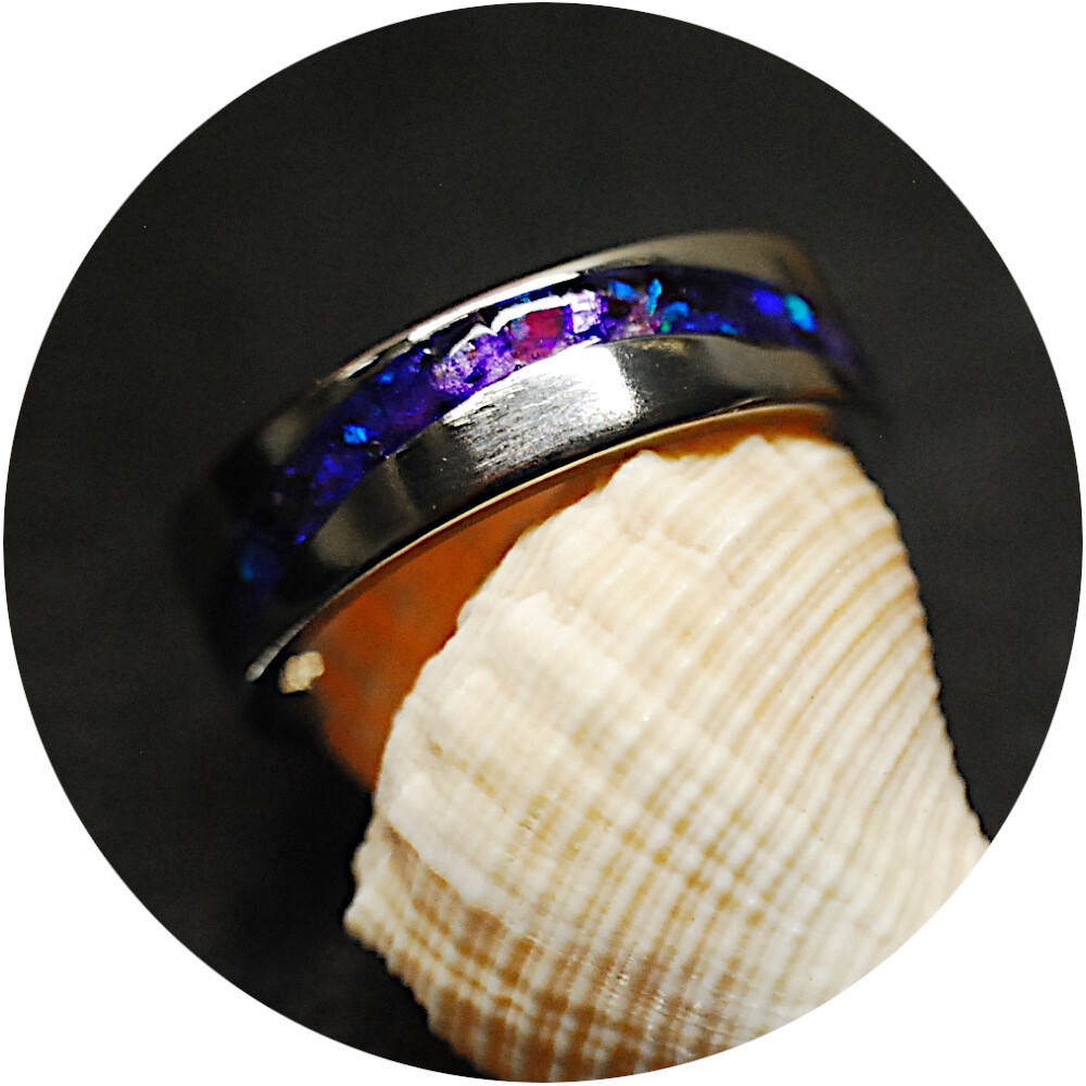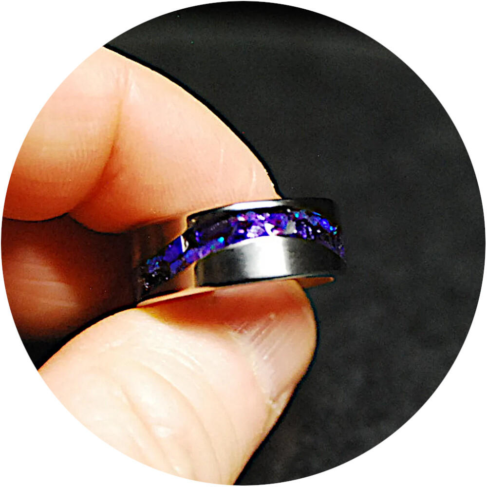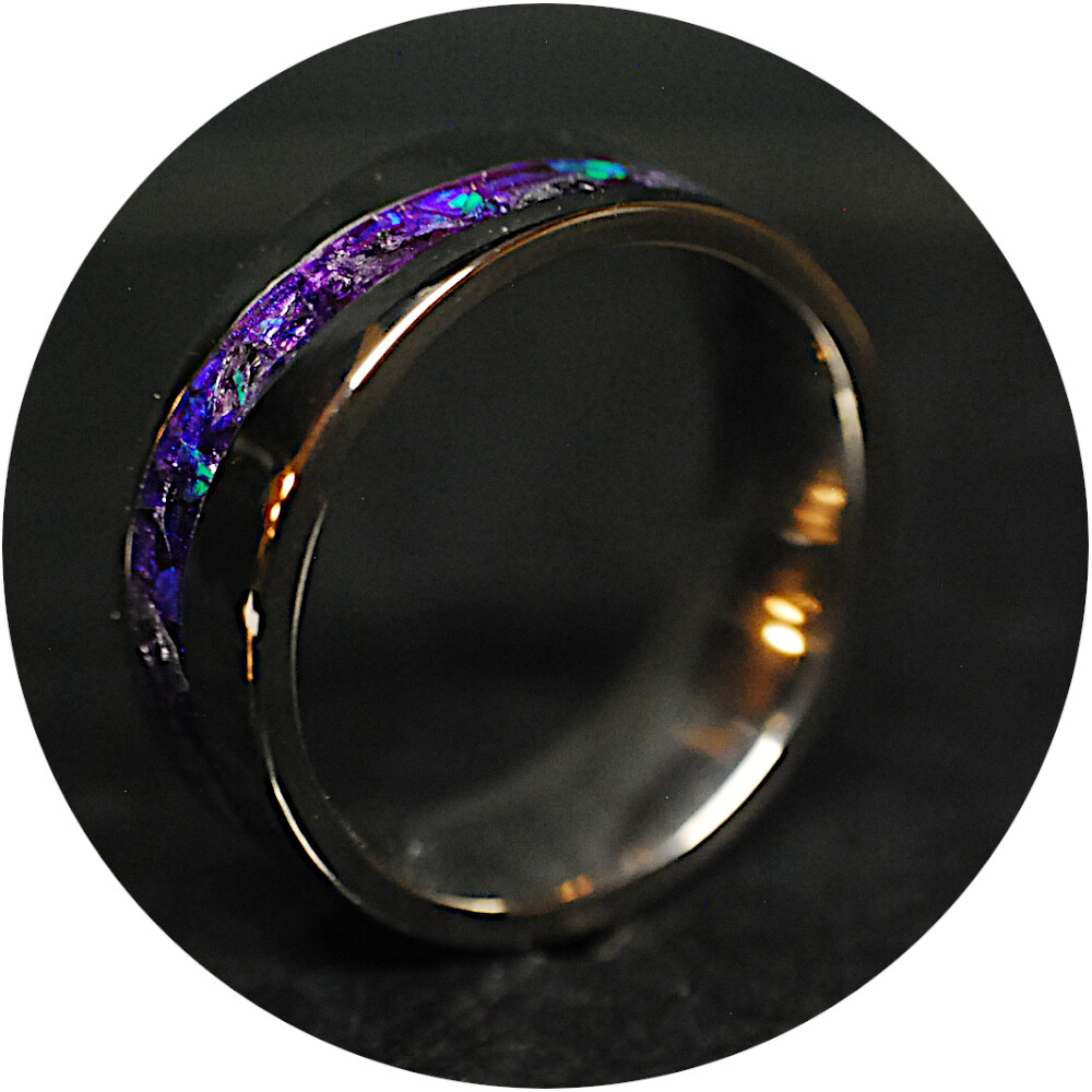 Titanium S Wave Comfort Ring 8mm wide single channel, inlaid with premium grade Bello Opal® gemstone from Japan, with the brilliant Indigo Opal and Purple Glass Shards. Durable High gloss, waterproof finish!