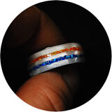 Beautiful Stainless Steel Ring mounted with Pearl White Acrylic inlaid with Orange and Blue Crushed Opal on Comfort Band. The Crushed Opal inlay is encased in acrylate for a high gloss, very durable waterproof finish for daily wear!