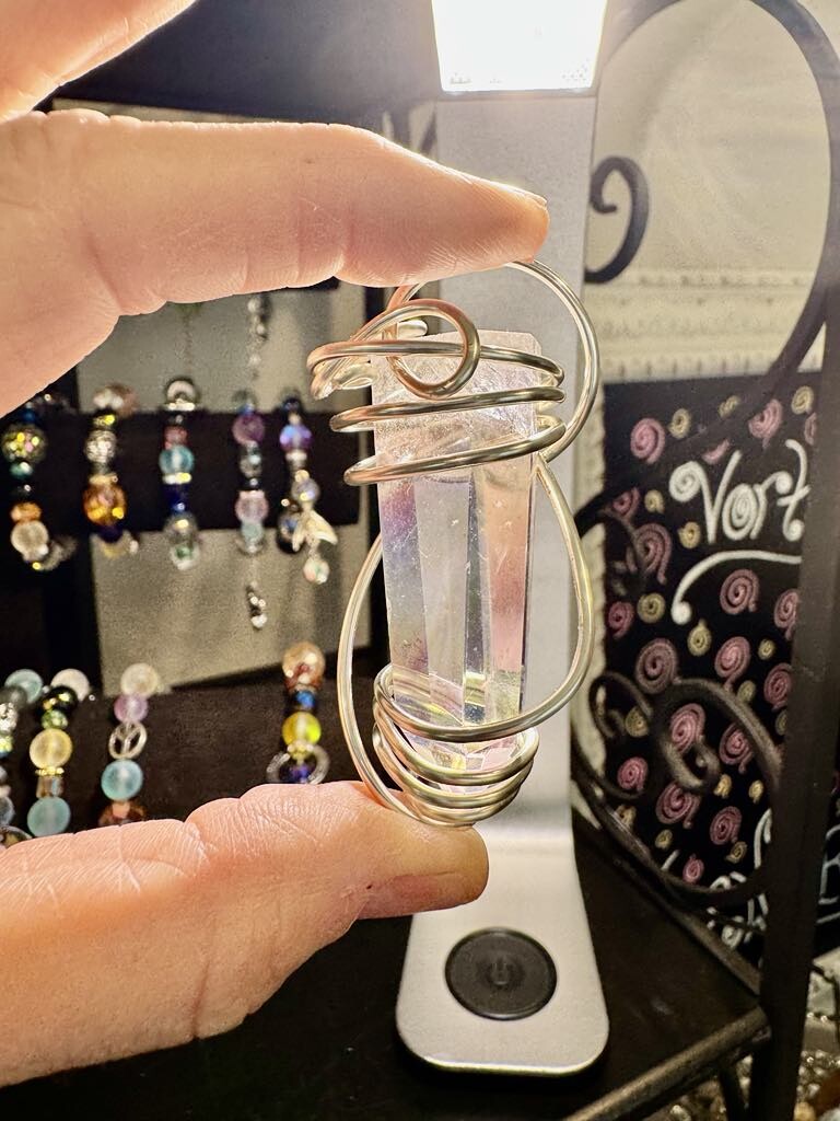Beautifully handcrafted Quartz Crystal treated with Titanium Dioxide, wrapped in silver coated copper wire. Jewelry Pendant by Barbara Symons. Ships from Texas, USA.