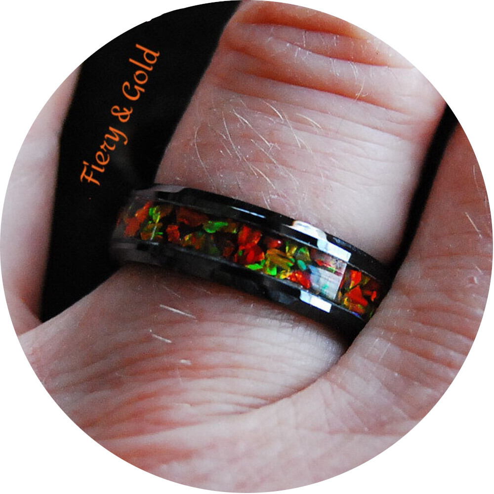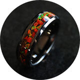 Beautifully handcrafted Flamed Red & Gold Opal Ring inlaid on a 6mm or 8mm Black Ceramic Comfort Band.