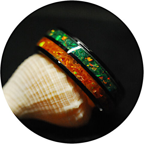 Double Channel Black Ceramic Ring inlaid with Orange and Green Crushed Opal on Comfort Band. The Crushed Opal inlay is encased in acrylate for a high gloss, very durable waterproof finish for daily wear!