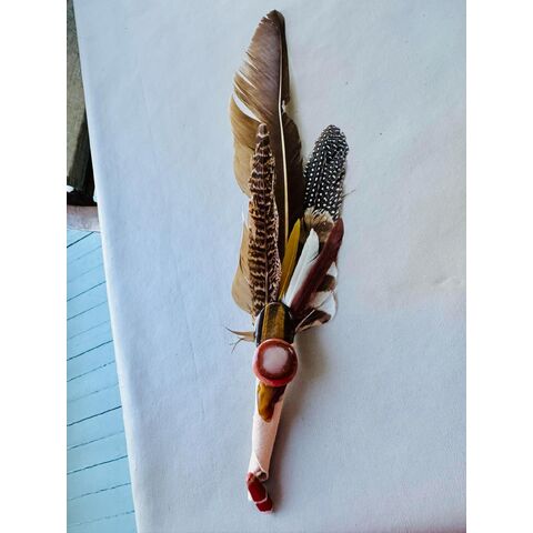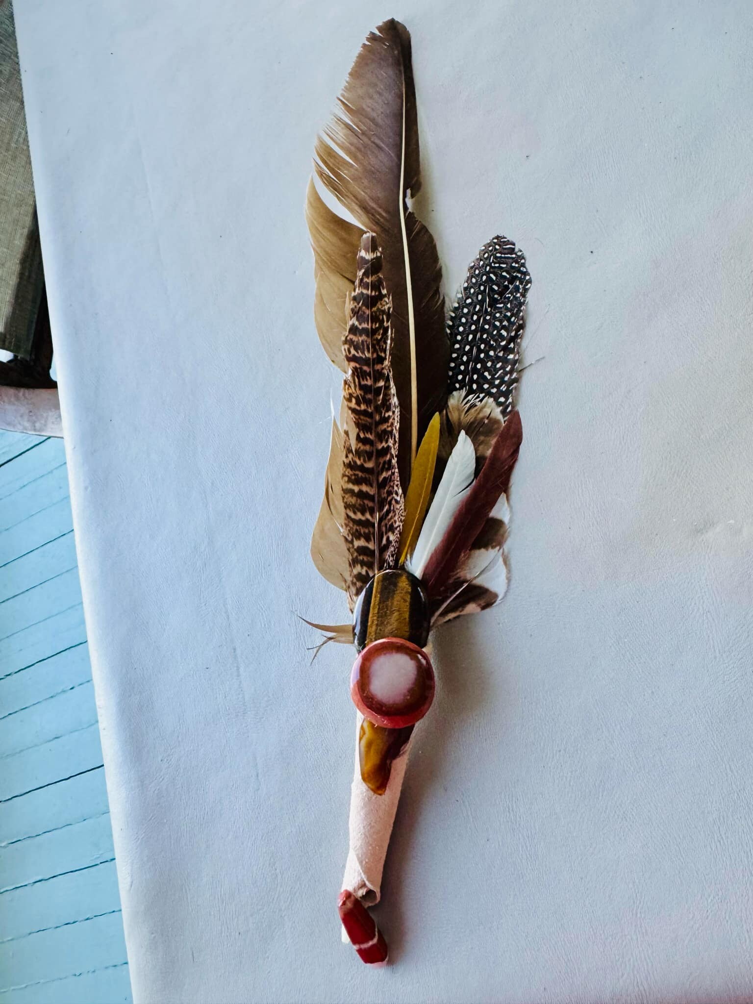 Hand held smudging stick with Mookaite & Tigers Eye Gemstone and wild bird feathers from South Texas, USA. Wrapped in Deer Hide.