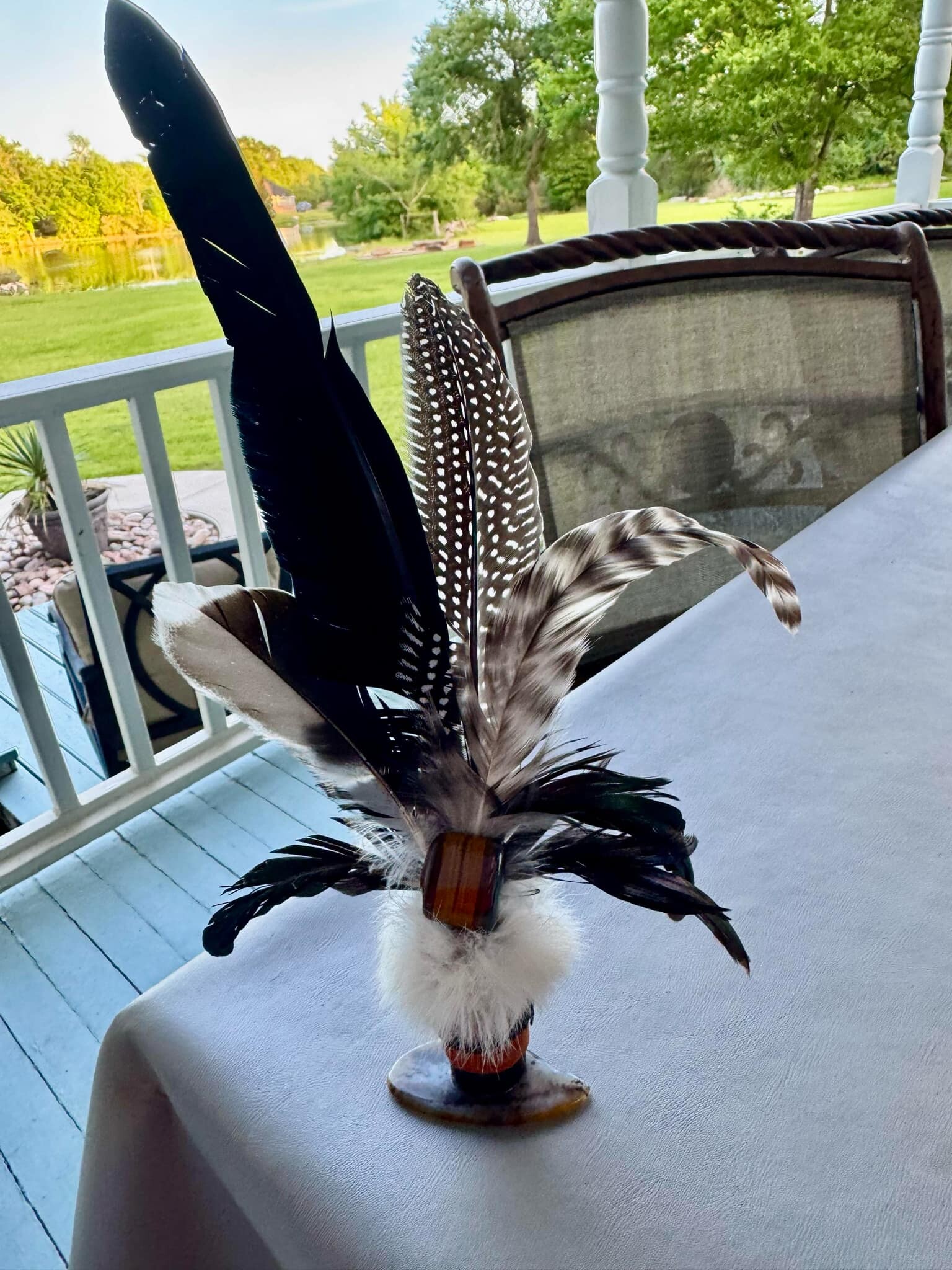 Pedestal Feather Smudging Stick with Tigers Eye Crystal and Rabbit Fur. Wild Bird feathers from South Texas, USA.