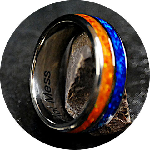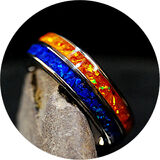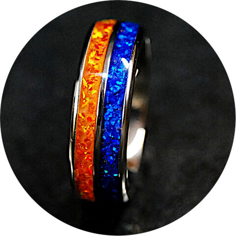 Orange Fire & Blue Ice Crushed Opal Ring inlaid on Titanium 8mm Band. Twin Flame Ring for Unisex!